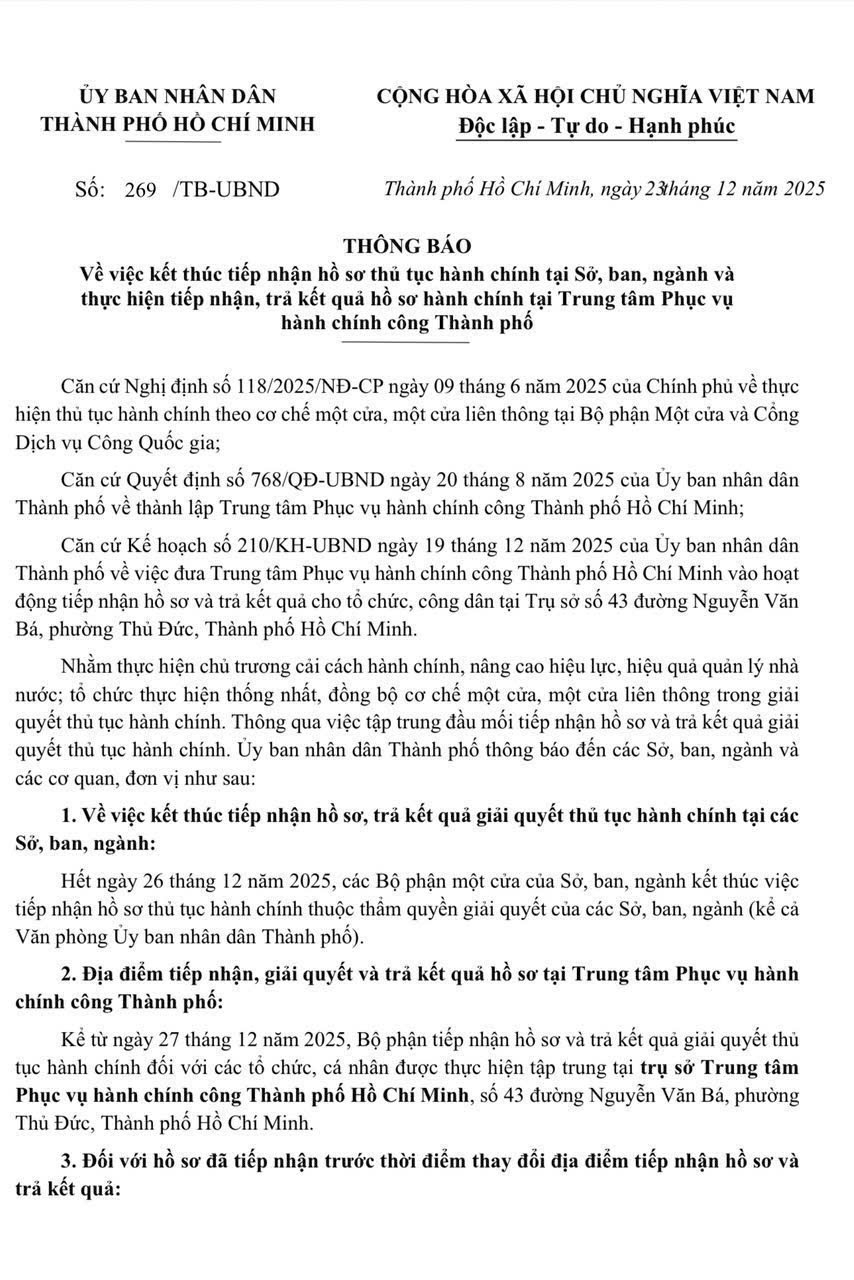 THÔNG BÁO Về việc kết thúc tiếp nhận hồ sơ thủ tục hành chính tại Sở, ban, ngành và thực hiện tiếp nhận, trả kết quả hồ sơ hành chính tại Trung tâm Phục vụ hành chính công Thành phố
