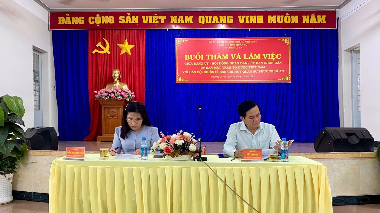 Sáng ngày 23/7, ông Võ Văn Hồng – Bí thư Đảng ủy, Chủ tịch HĐND phường Dĩ An và bà Trần Thị Thanh Thủy - Phó Bí thư Đảng ủy, Chủ tịch UBND phường đã có buổi đến thăm và làm việc với tập thể cán bộ, chiến sĩ Ban Chỉ huy Quân sự phường Dĩ An về tình hình triển khai, thực hiện công tác quân sự, quốc phòng tại địa phương sau sáp nhập.