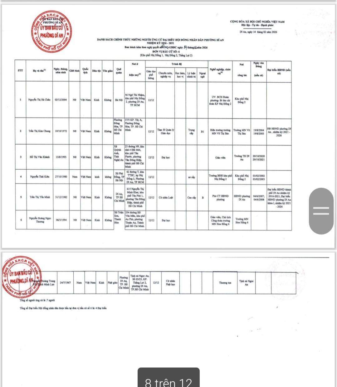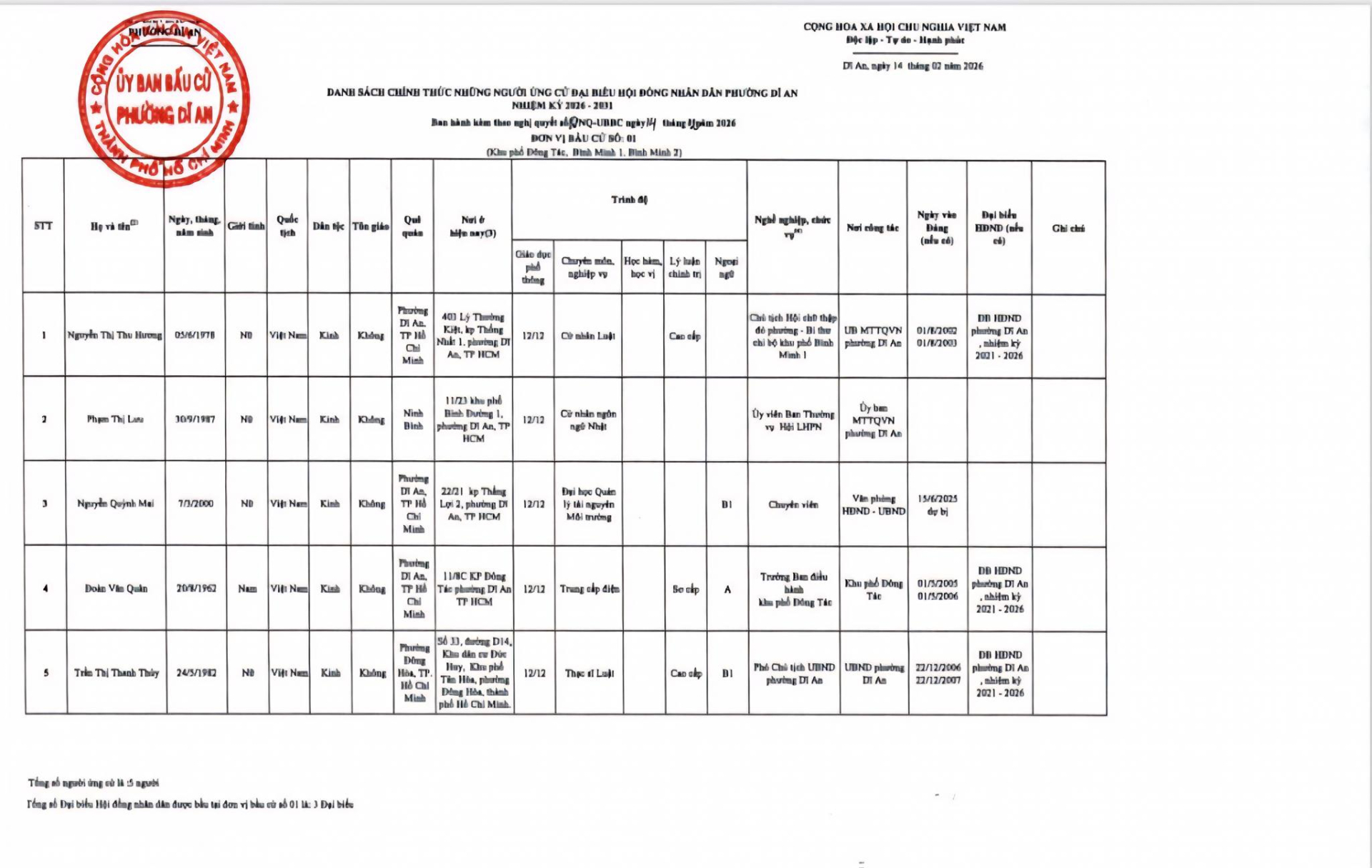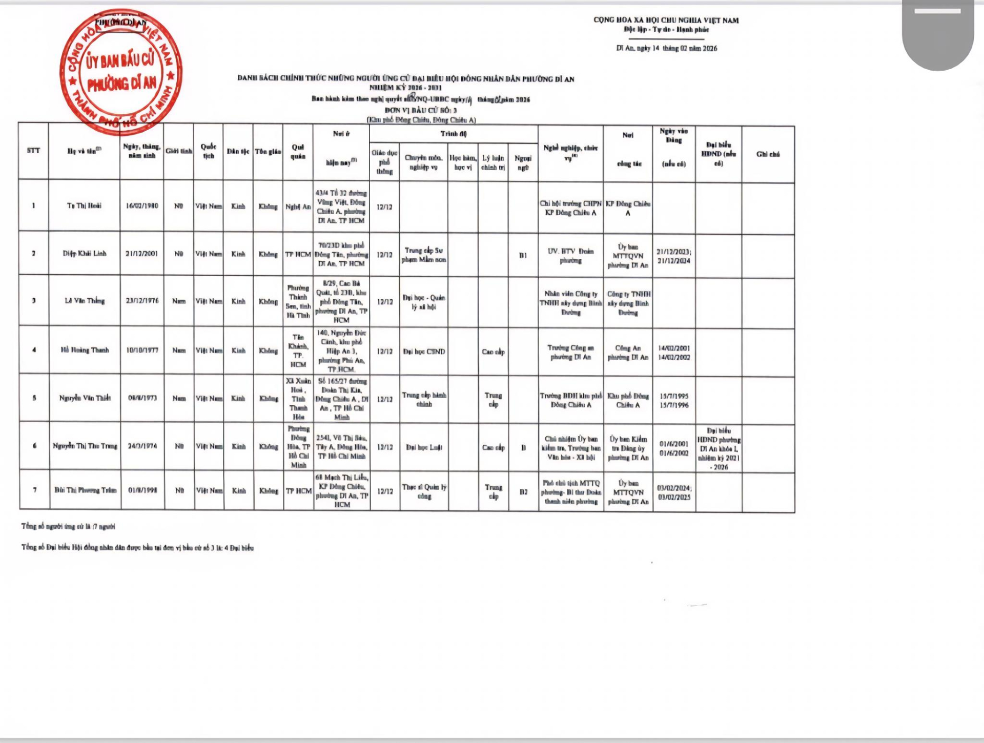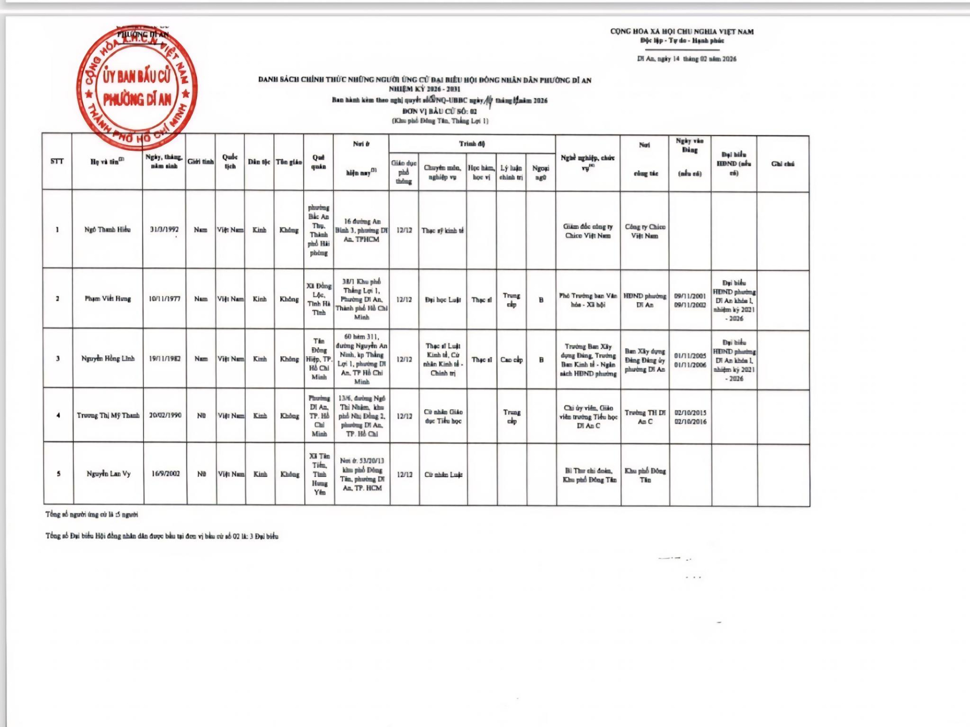 PHƯỜNG DĨ AN CÔNG BỐ DANH SÁCH CHÍNH THỨC ỨNG CỬ VIÊN ĐẠI BIỂU HĐND PHƯỜNG NHIỆM KỲ 2026-2031