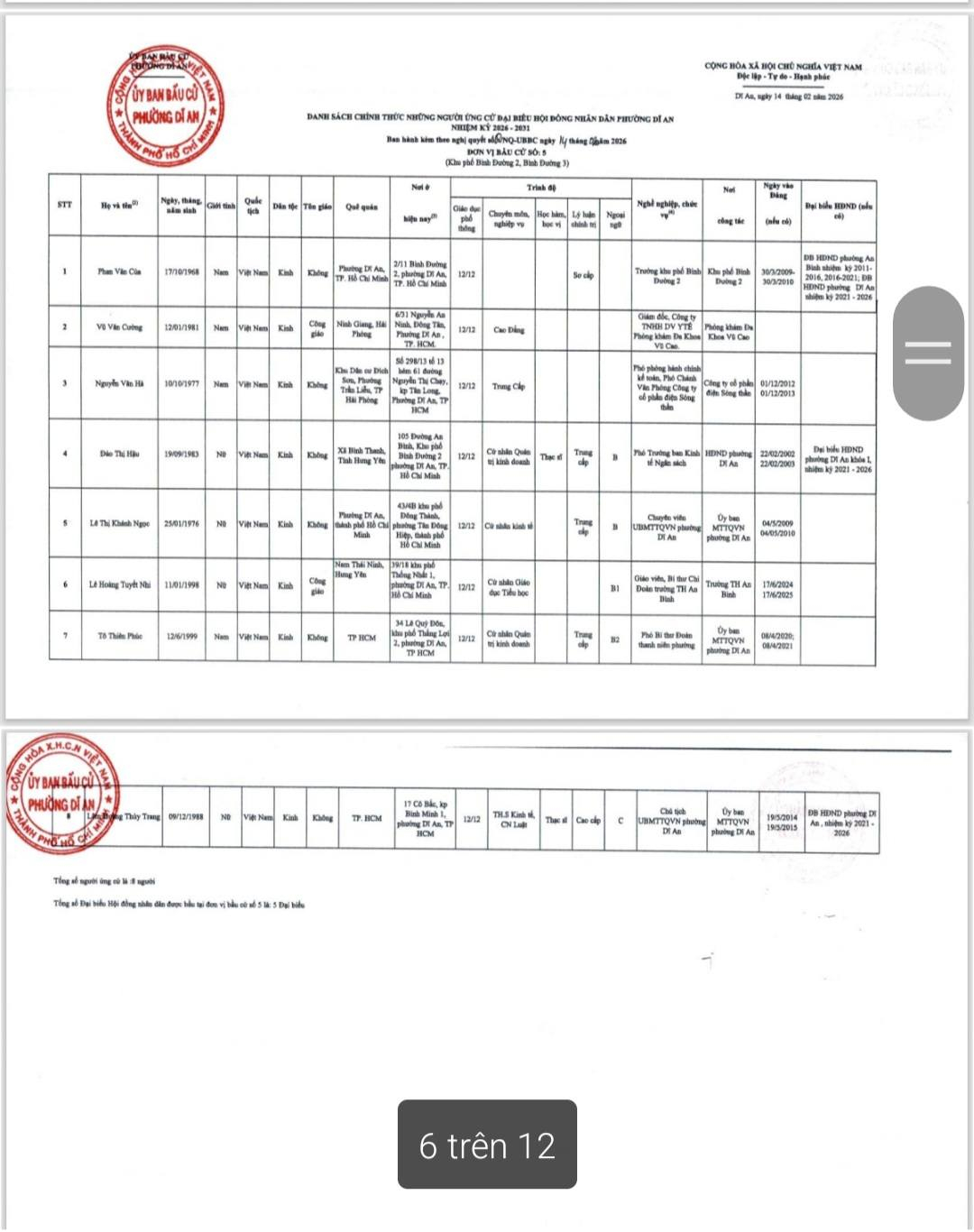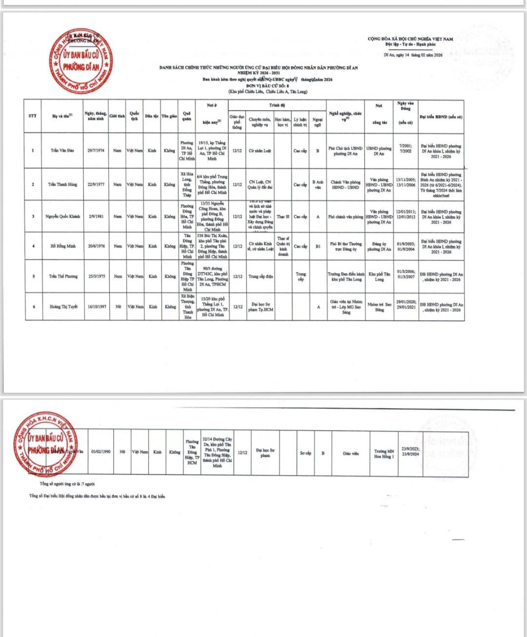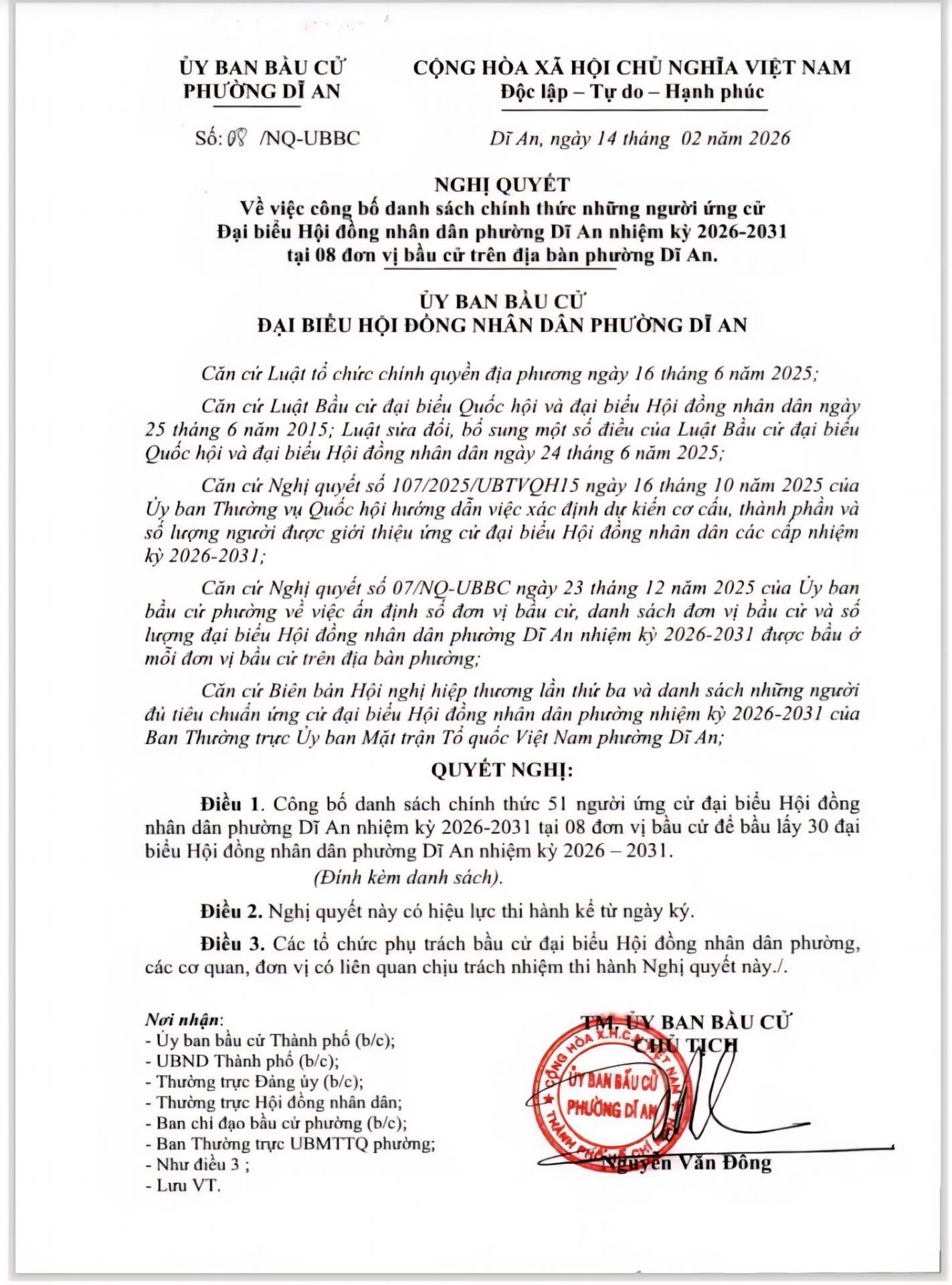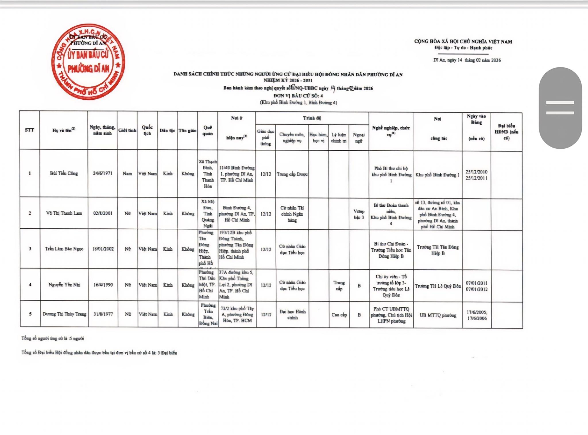 PHƯỜNG DĨ AN CÔNG BỐ DANH SÁCH CHÍNH THỨC ỨNG CỬ VIÊN ĐẠI BIỂU HĐND PHƯỜNG NHIỆM KỲ 2026-2031