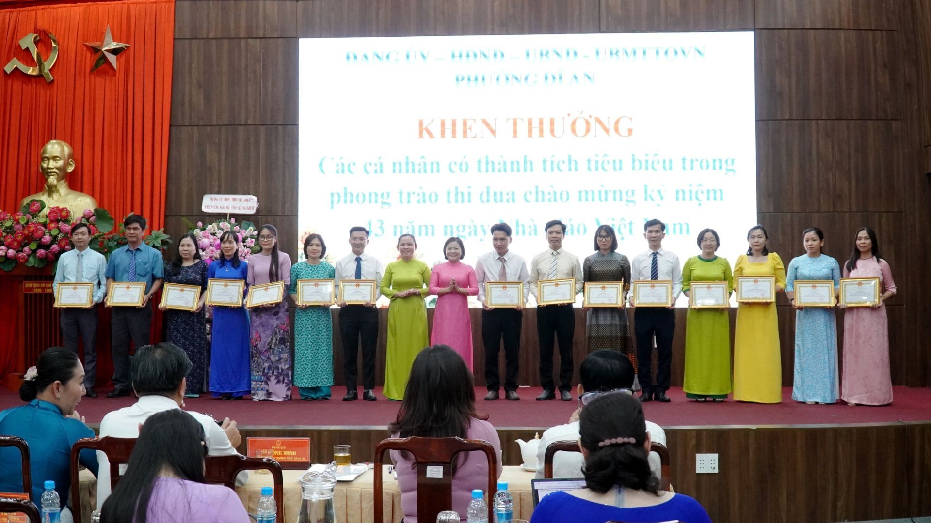 Buổi họp mặt diễn ra trong không khí ấm áp, nghĩa tình. Lãnh đạo phường đã trao tặng quà tri ân cho các nhà giáo hưu trí có nhiều cống hiến cho sự nghiệp trồng người tại TP Dĩ An (cũ). Dịp này, UBND phường Dĩ An khen thưởng 64 cá nhân tiêu biểu có thành tích xuất sắc trong phong trào thi đua chào mừng kỷ niệm 43 năm Ngày Nhà giáo Việt Nam.