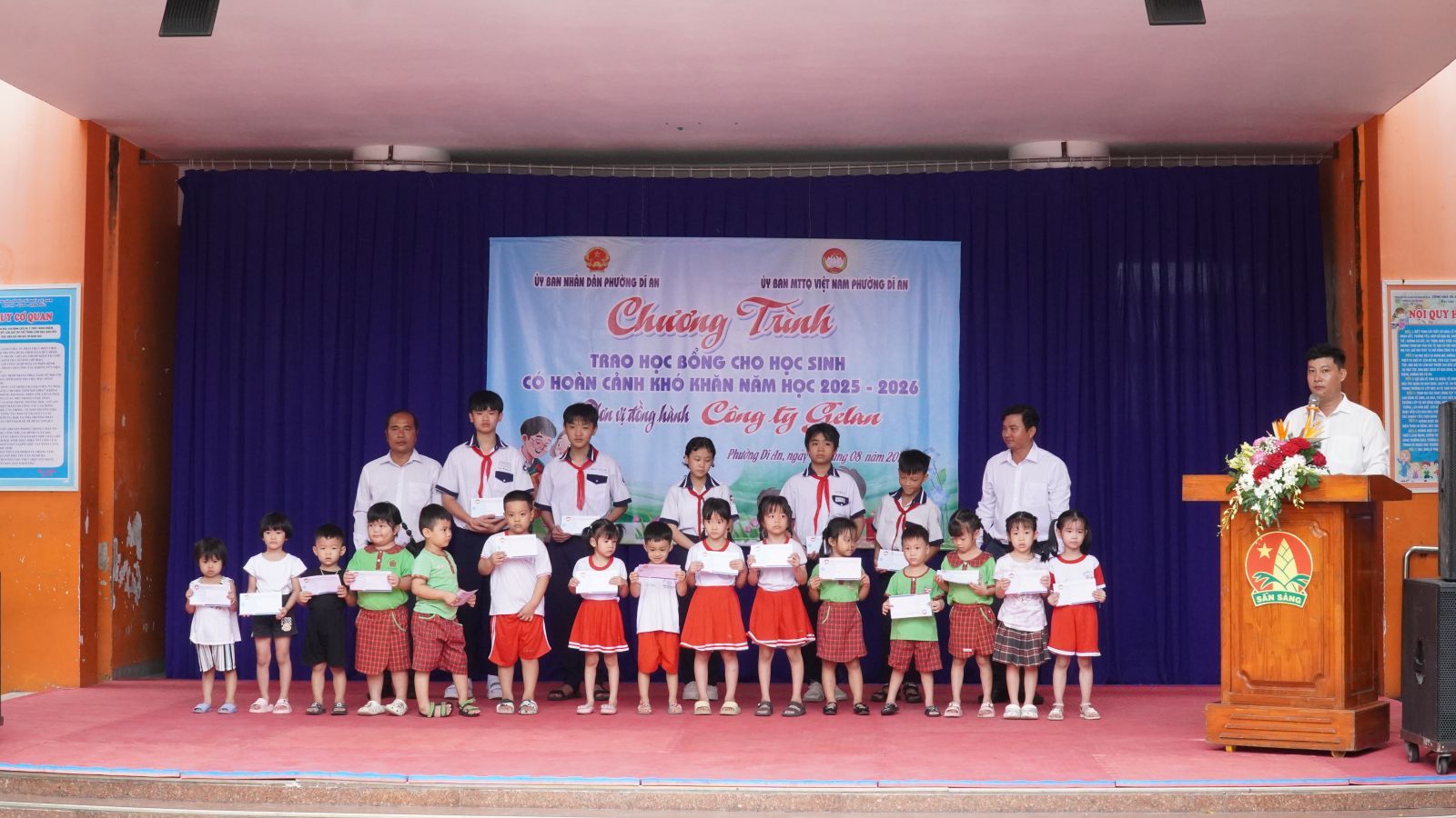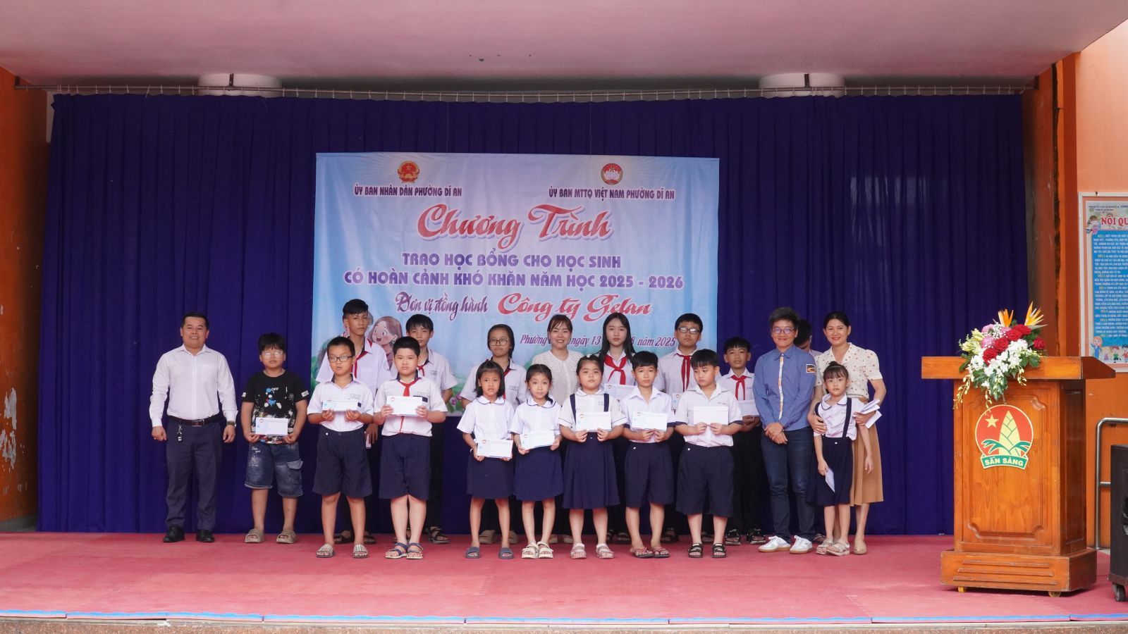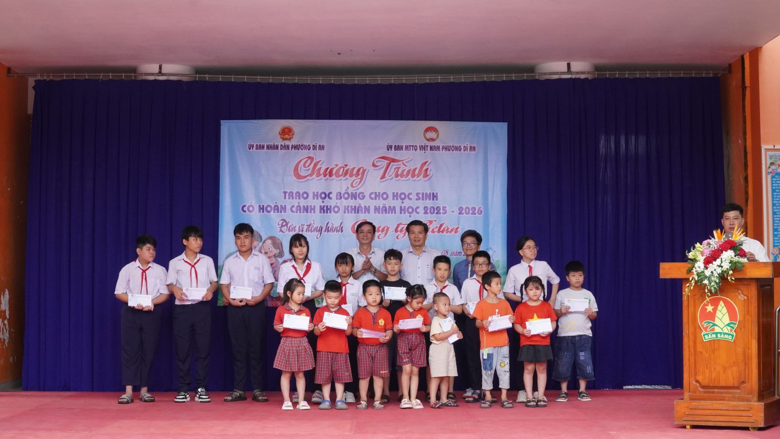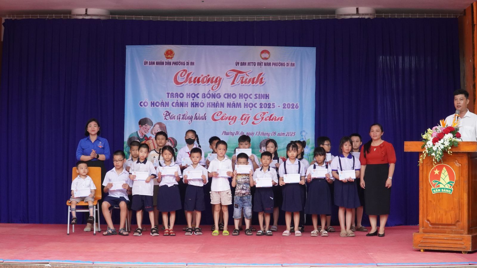 100 phần quà là tiền mặt trị giá 500 ngàn đồng/ phần đã được lãnh đạo phường và đơn vị tài trợ trao tận tay các em học sinh khối mầm non, tiểu học có hoàn cảnh khó khăn trên địa bàn phường Dĩ An trước thềm năm học mới 2025-2026, tổng kinh phí trao quà là 50 triệu đồng do công ty Gelan tài trợ. Các em học sinh khi nhận học bổng đã bày tỏ sự xúc động và biết ơn trước những tình cảm yêu thương của lãnh đạo địa phương và các mạnh thường quân đã luôn quan tâm, dành sự sẻ chia đến những hoàn cảnh khó khăn, tiếp sức các em đến trường. Qua đó các em cũng hứa cố gắng quyết tâm học tập thật tốt để sau này góp sức xây dựng quê hương Dĩ An thêm giàu đẹp.