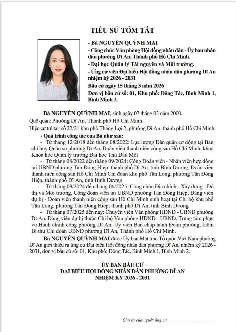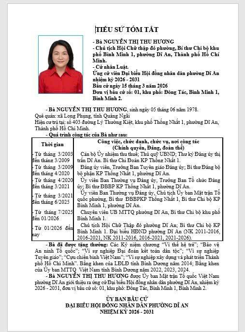 TIỂU SỬ TÓM TẮT CÁC ỨNG CỬ VIÊN ĐẠI BIỂU HĐND PHƯỜNG DĨ AN NK 2026 - 2031 (Đơn vị bầu cử số 1)