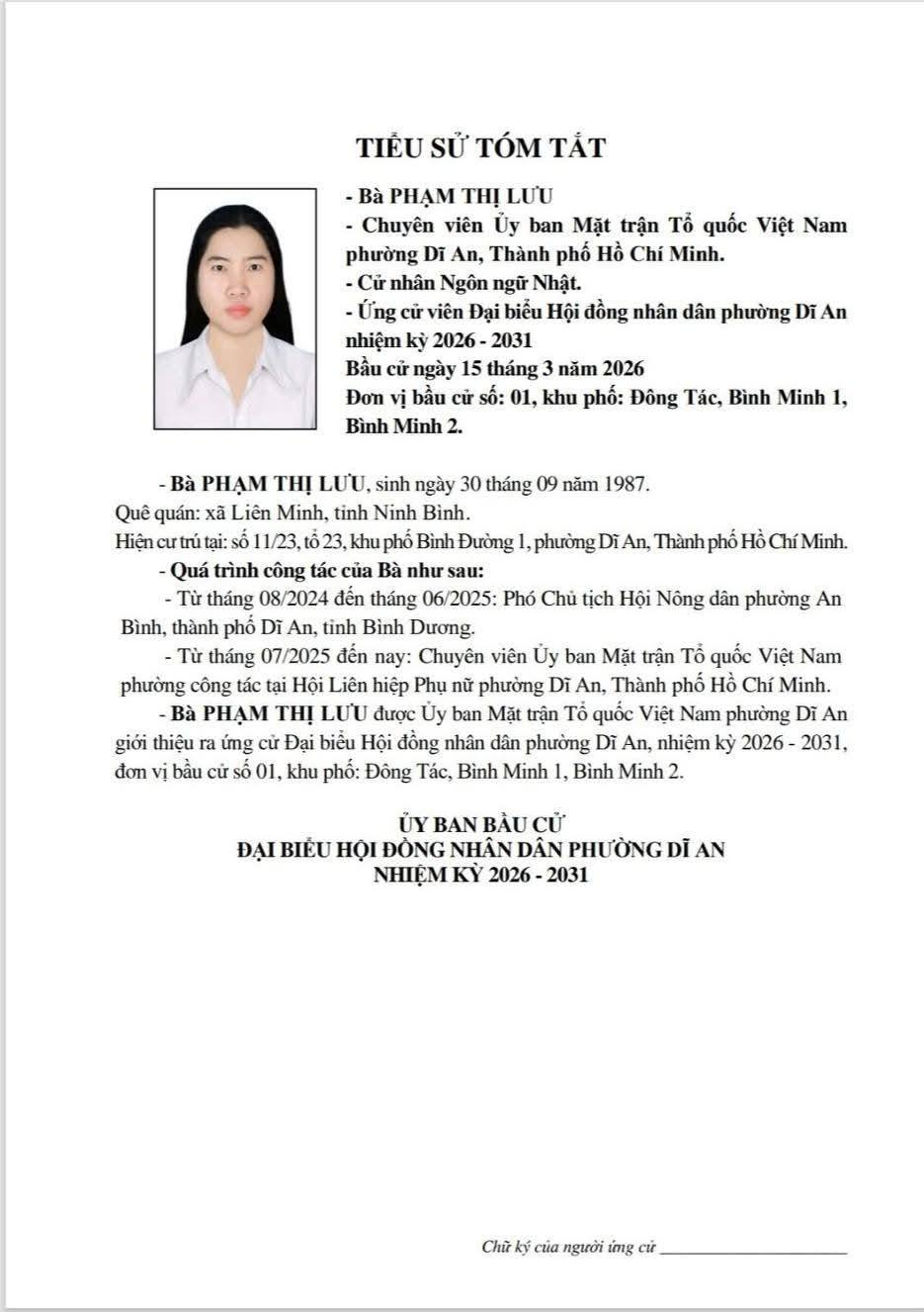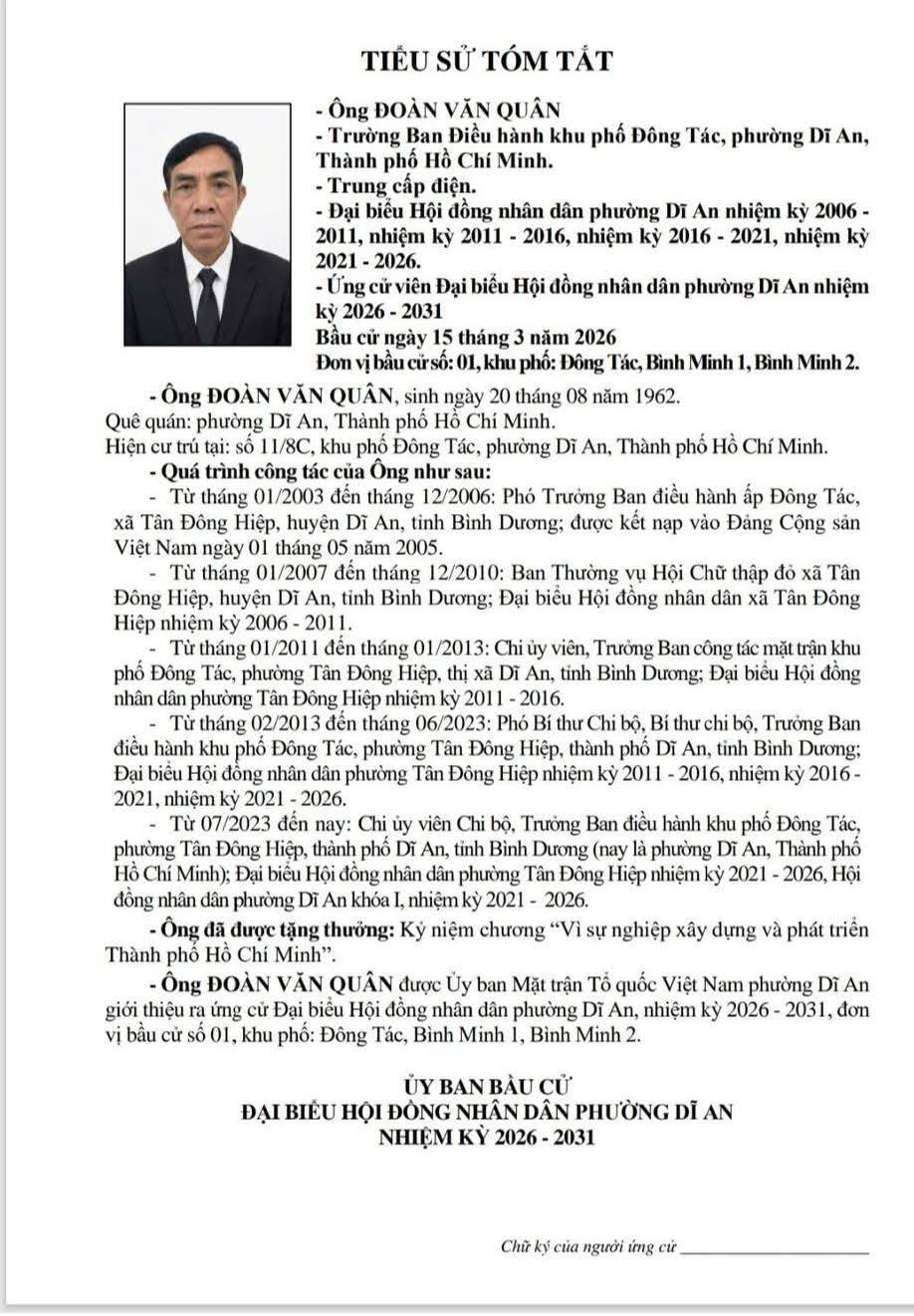 TIỂU SỬ TÓM TẮT CÁC ỨNG CỬ VIÊN ĐẠI BIỂU HỘI ĐỒNG NHÂN DÂN PHƯỜNG DĨ AN NHIỆM KỲ 2026 - 2031