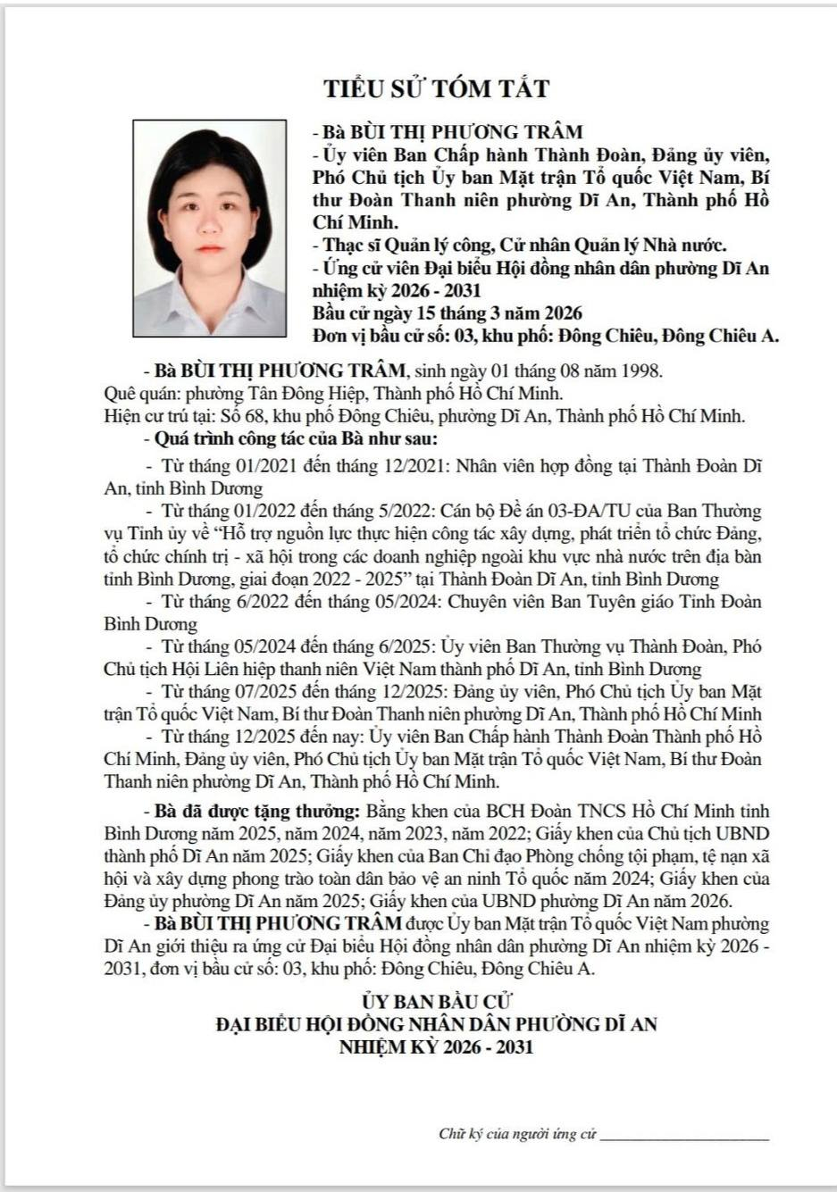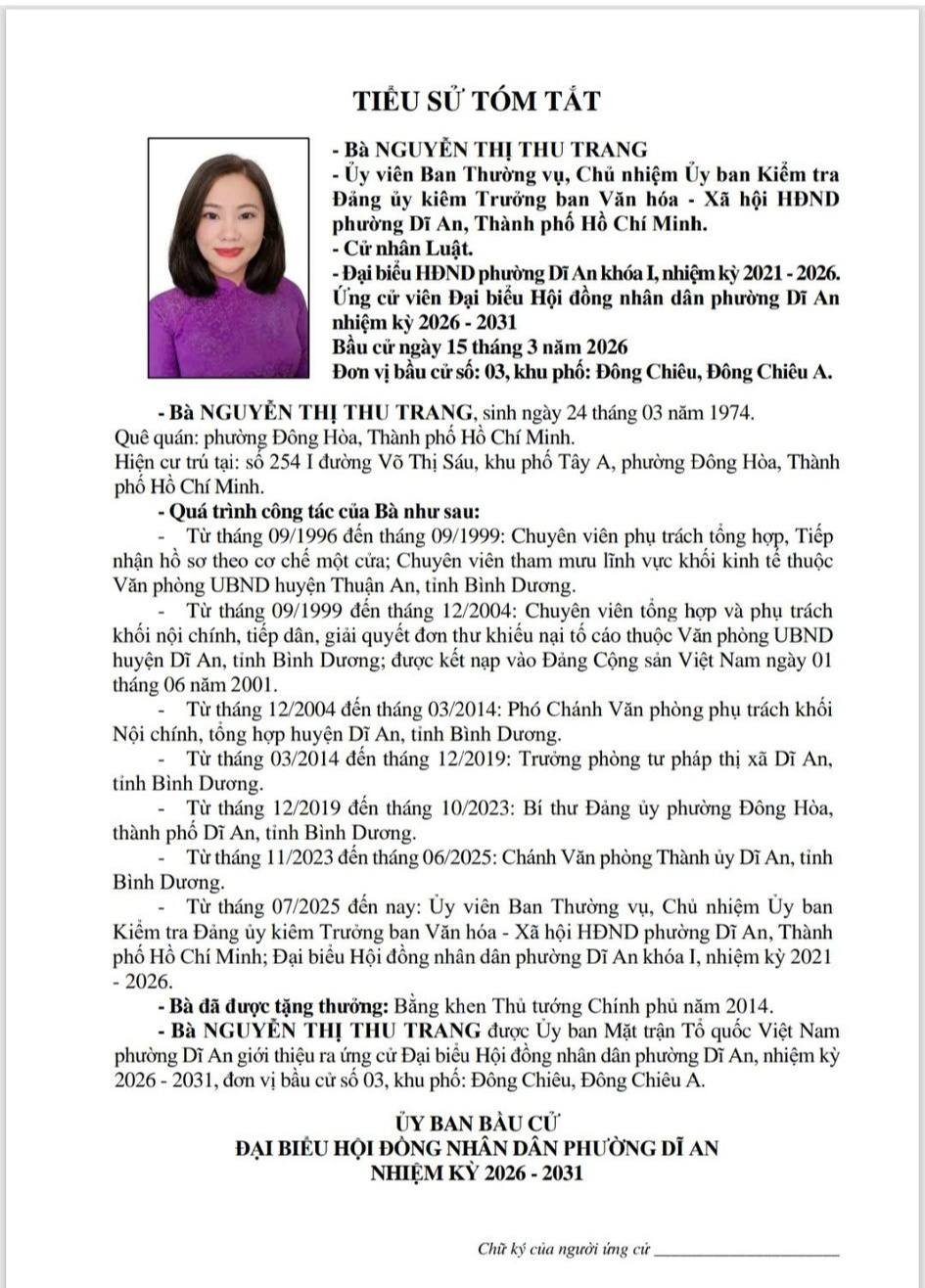 TIỂU SỬ TÓM TẮT CÁC ỨNG CỬ VIÊN ĐẠI BIỂU HĐND PHƯỜNG DĨ AN NK 2026 - 2031 (Đơn vị bầu cử số 3)