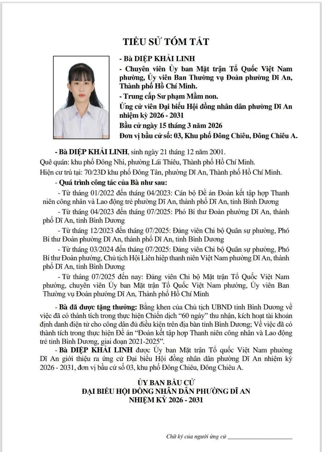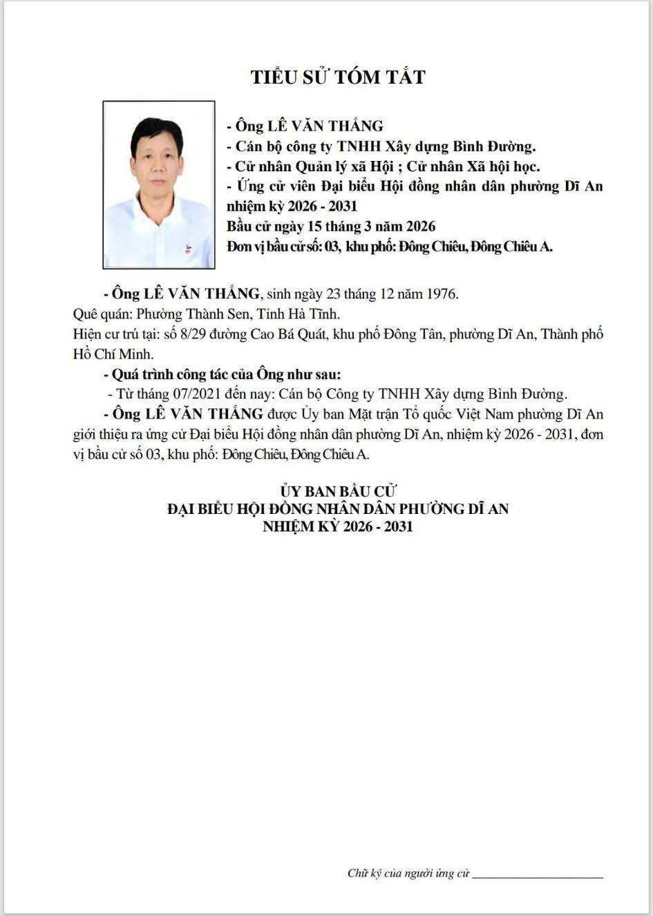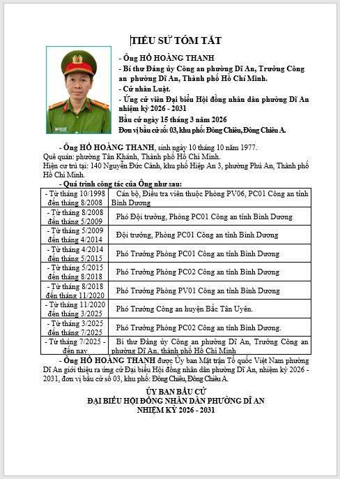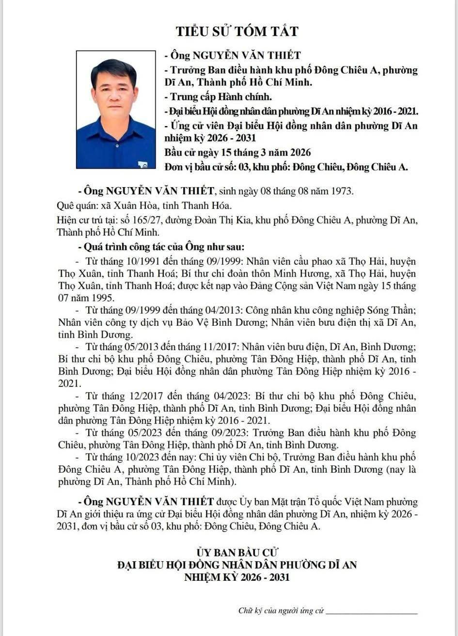 TIỂU SỬ TÓM TẮT CÁC ỨNG CỬ VIÊN ĐẠI BIỂU HỘI ĐỒNG NHÂN DÂN PHƯỜNG DĨ AN NHIỆM KỲ 2026 - 2031