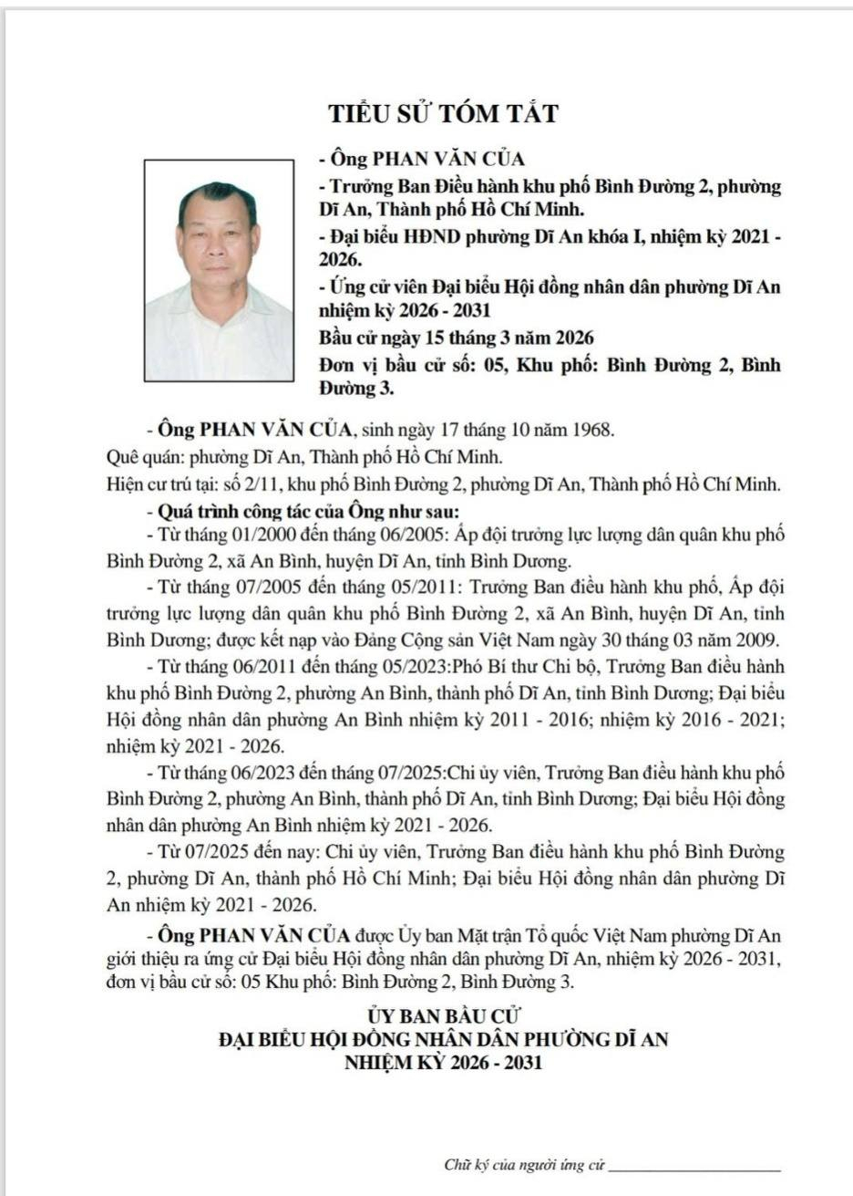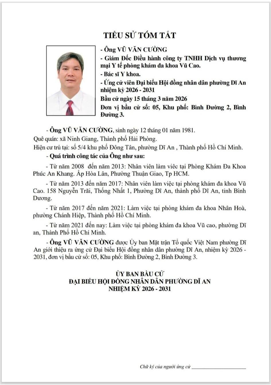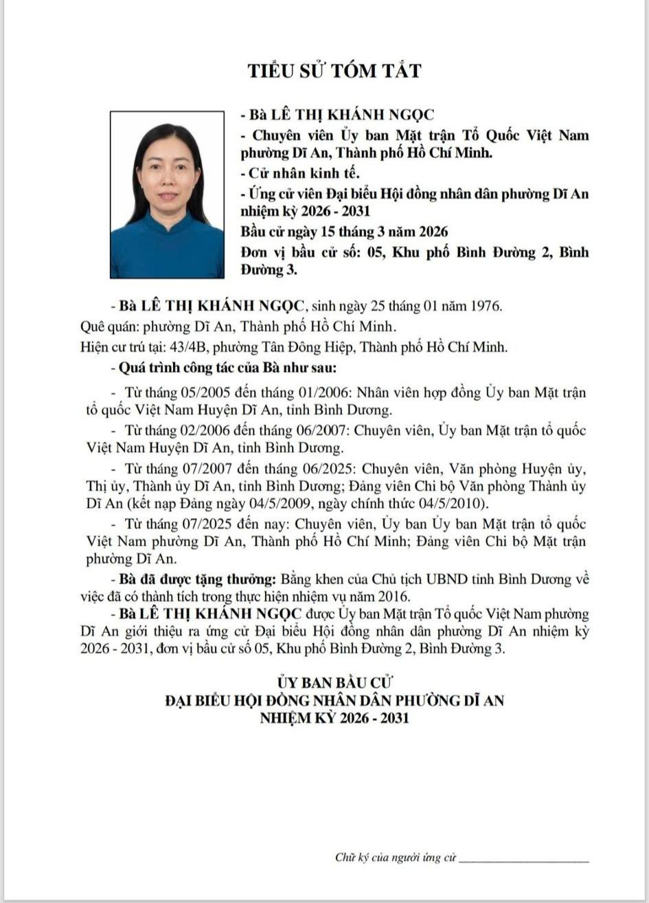TIỂU SỬ TÓM TẮT CÁC ỨNG CỬ VIÊN ĐẠI BIỂU HỘI ĐỒNG NHÂN DÂN PHƯỜNG DĨ AN NHIỆM KỲ 2026 - 2031