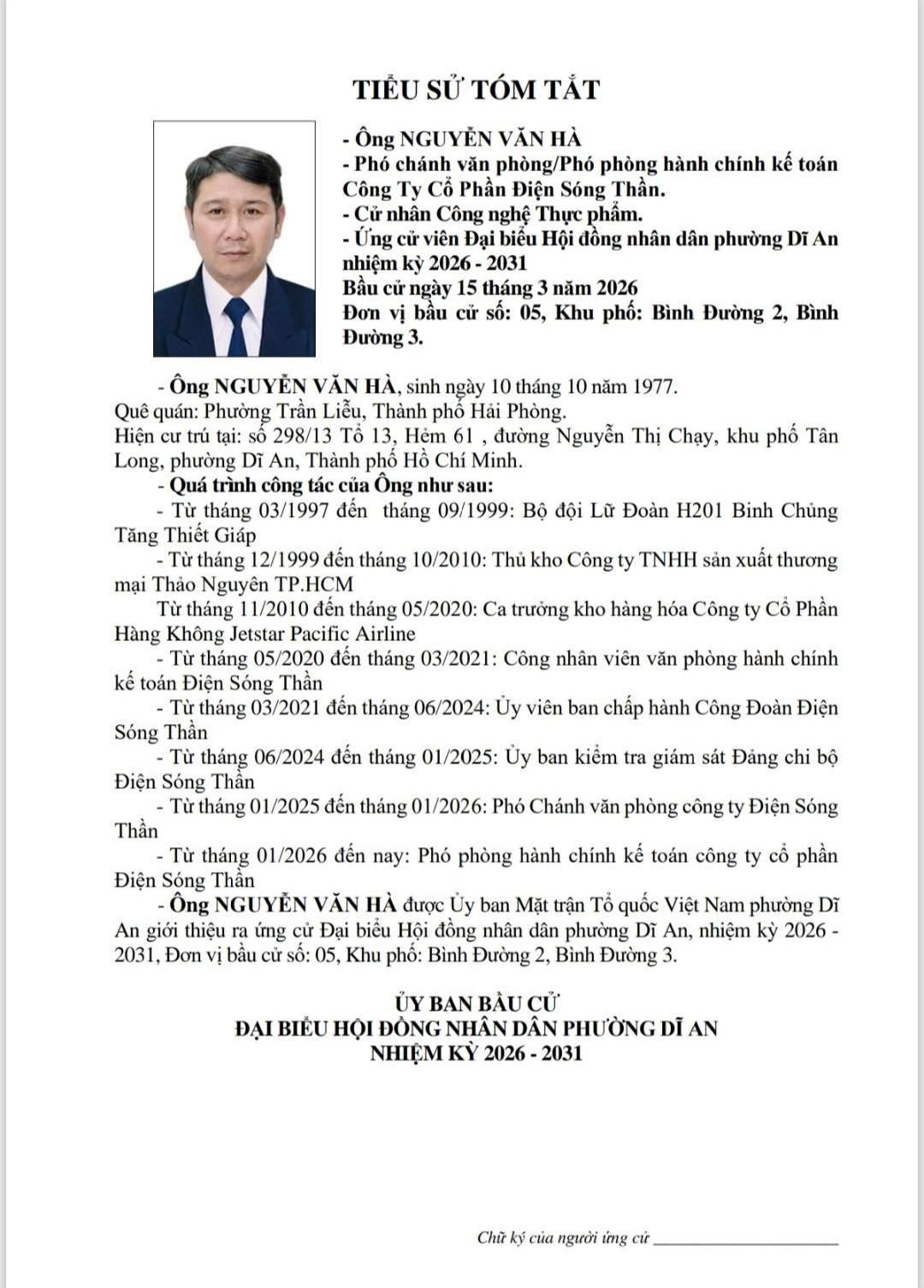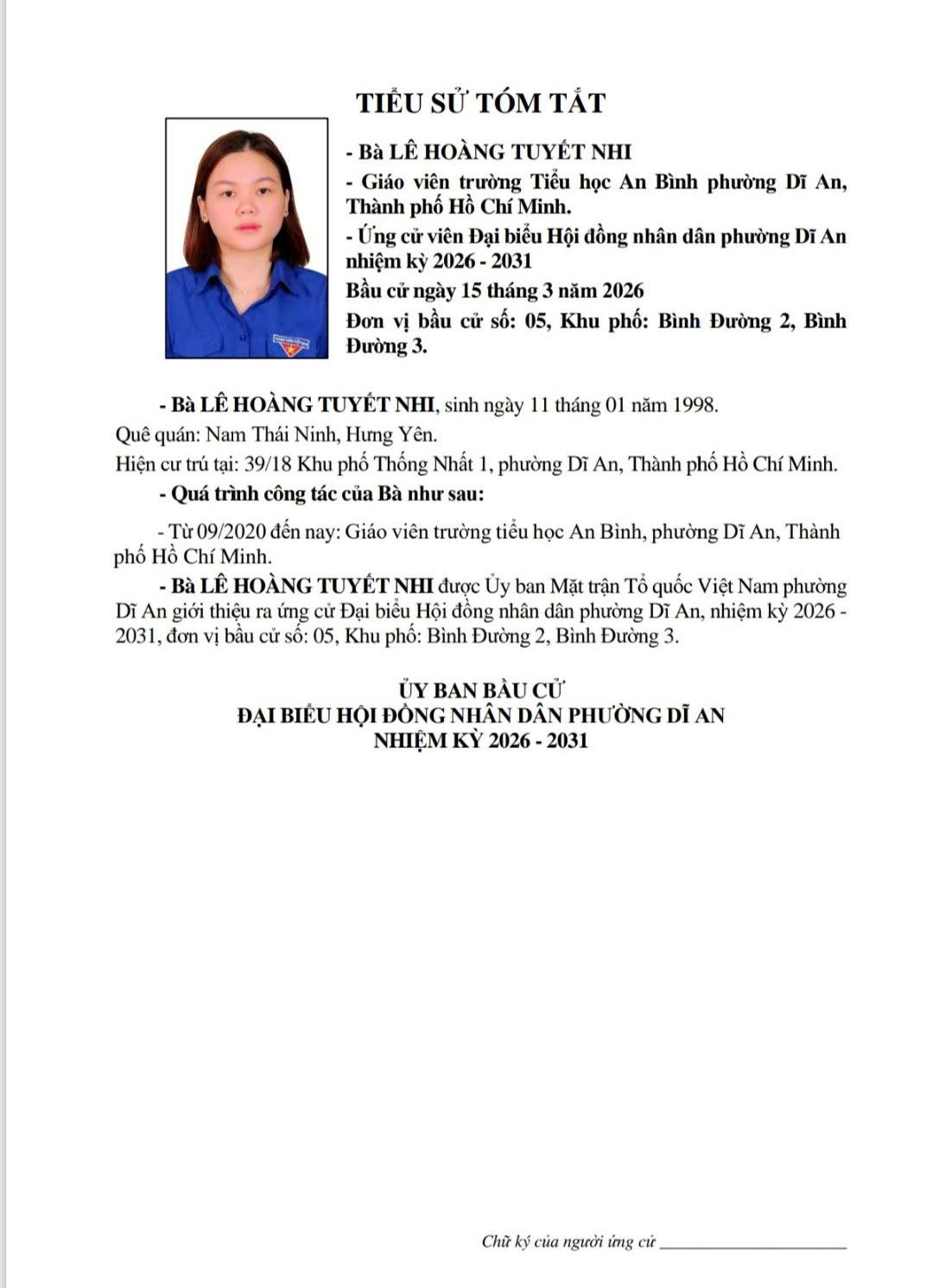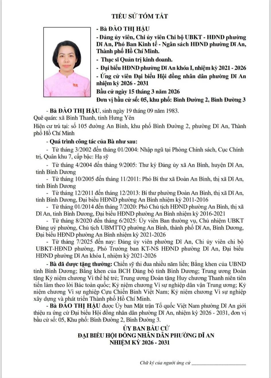 TIỂU SỬ TÓM TẮT CÁC ỨNG CỬ VIÊN ĐẠI BIỂU HỘI ĐỒNG NHÂN DÂN PHƯỜNG DĨ AN NHIỆM KỲ 2026 - 2031