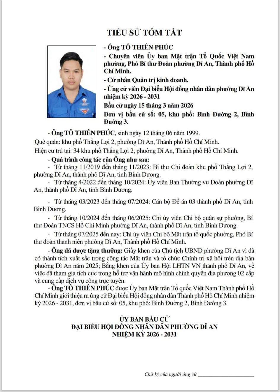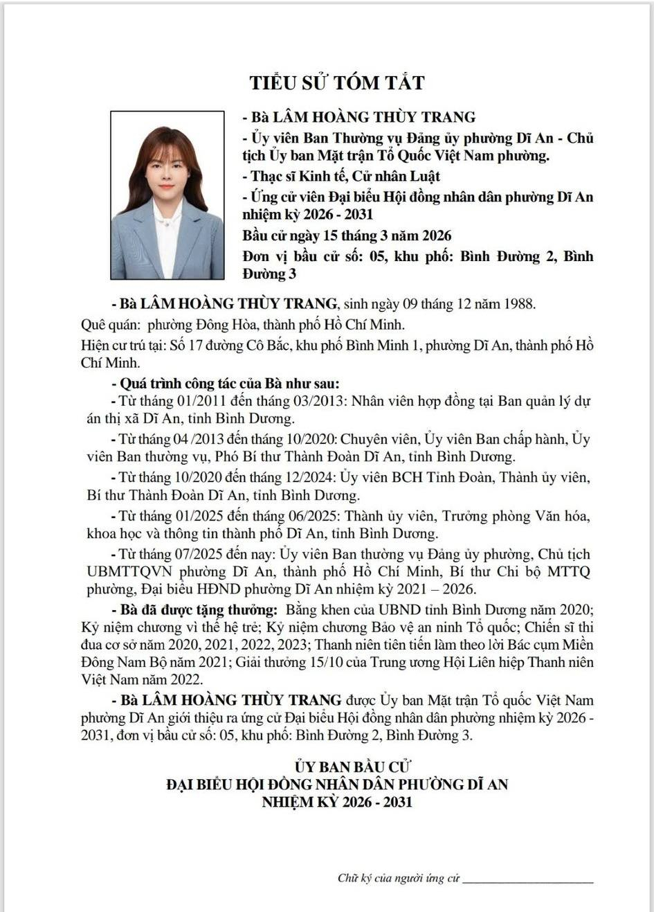 TIỂU SỬ TÓM TẮT CÁC ỨNG CỬ VIÊN ĐẠI BIỂU HĐND PHƯỜNG DĨ AN NK 2026 - 2031 (Đơn vị bầu cử số 5)