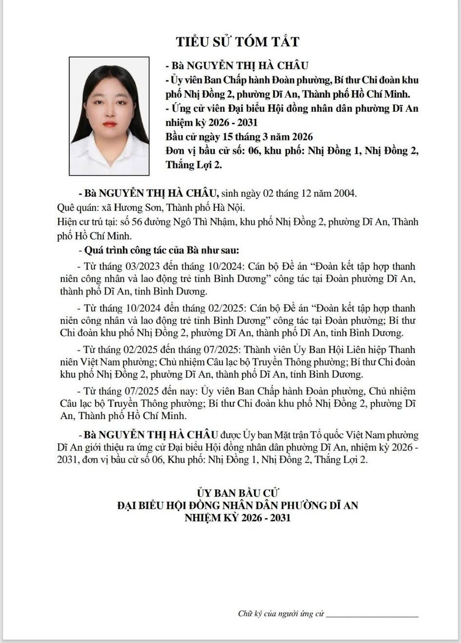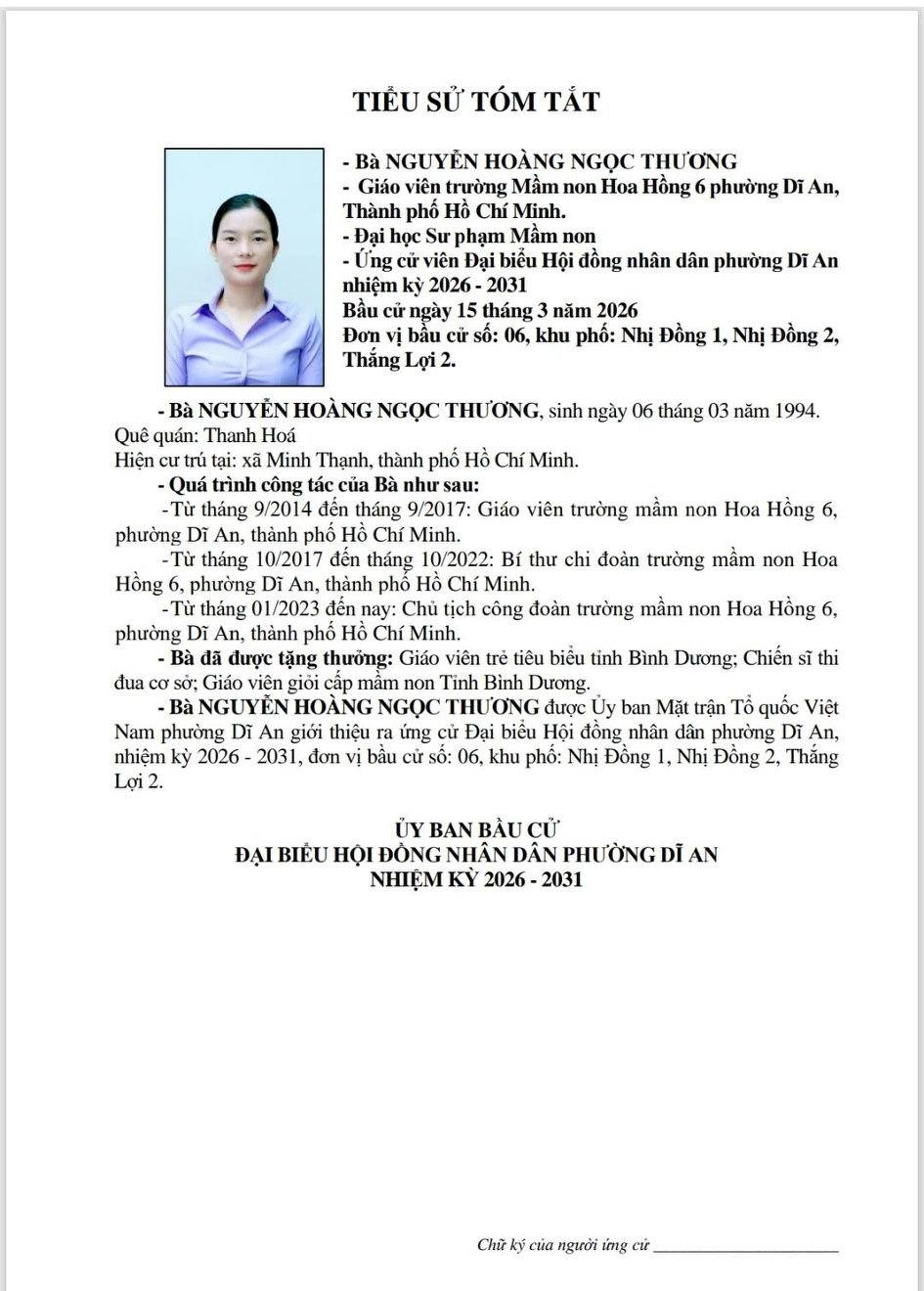 TIỂU SỬ TÓM TẮT CÁC ỨNG CỬ VIÊN ĐẠI BIỂU HĐND PHƯỜNG DĨ AN NK 2026 - 2031 (Đơn vị bầu cử số 6)