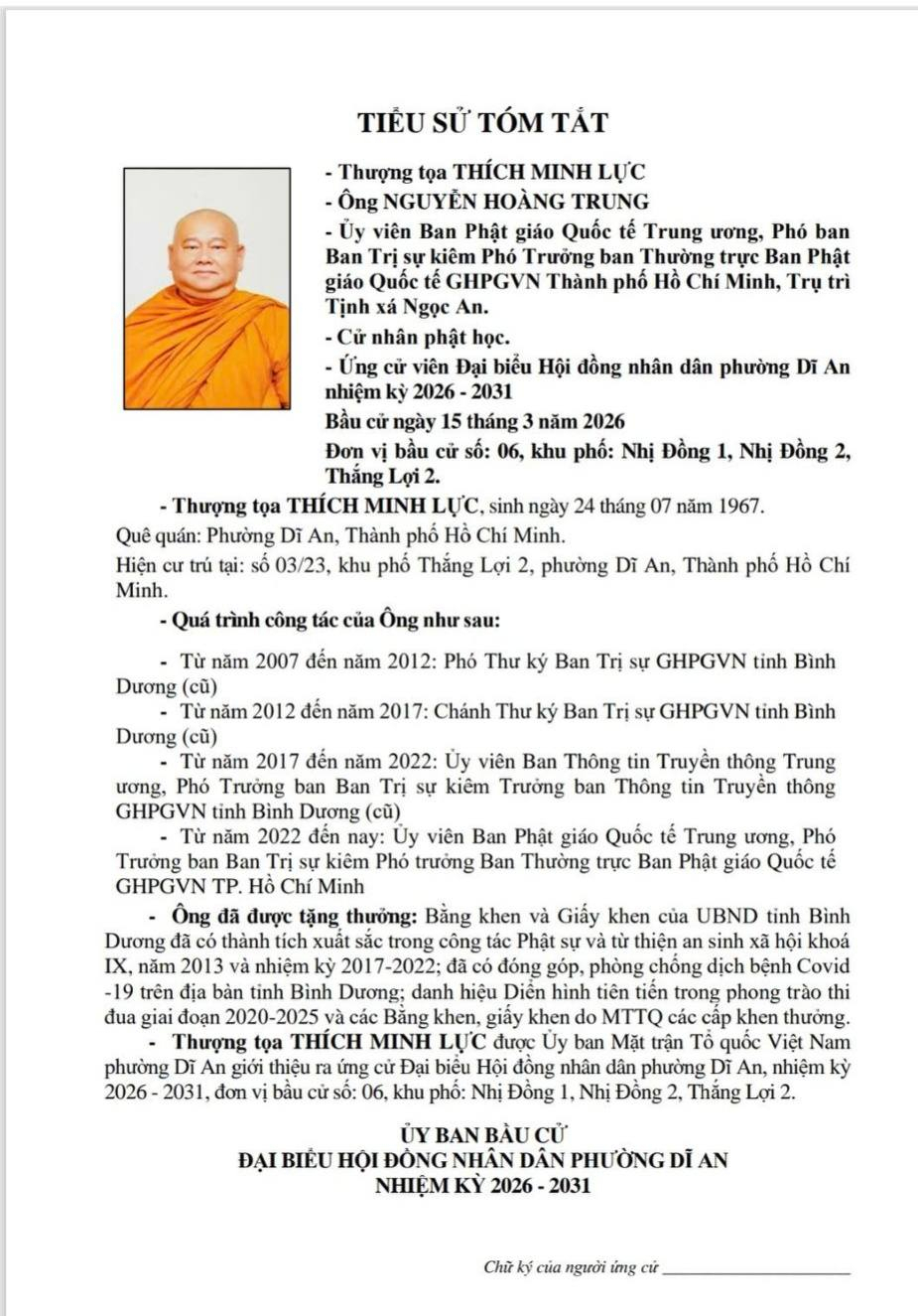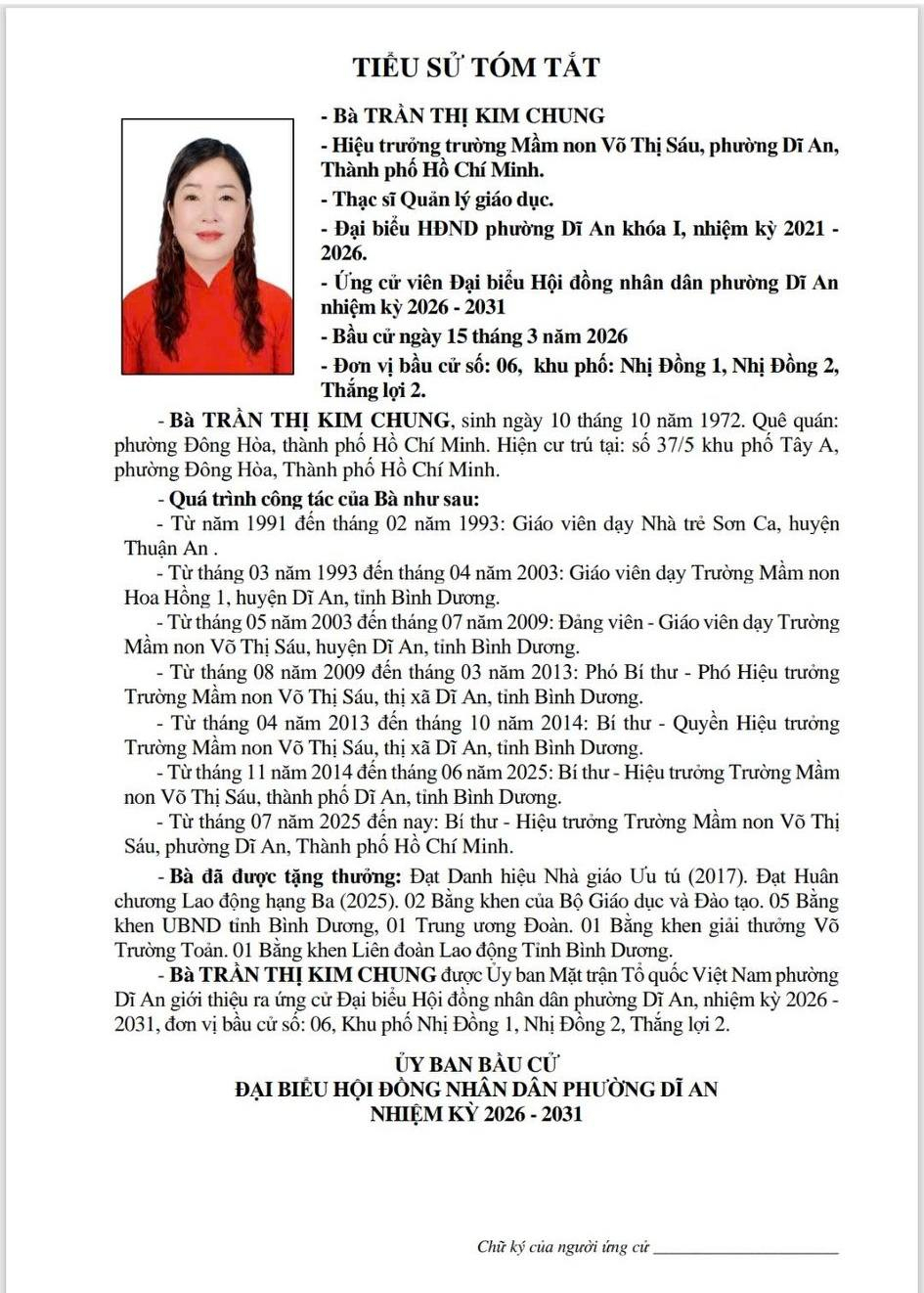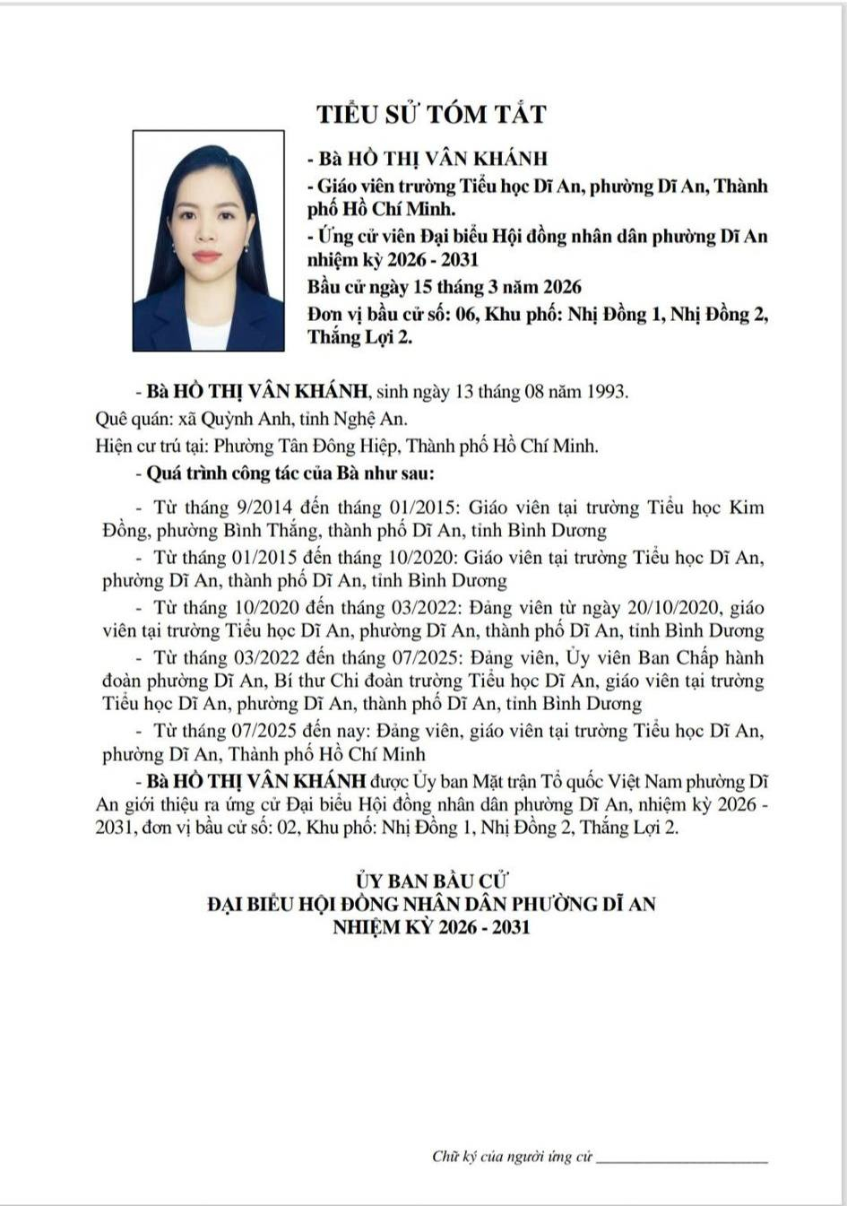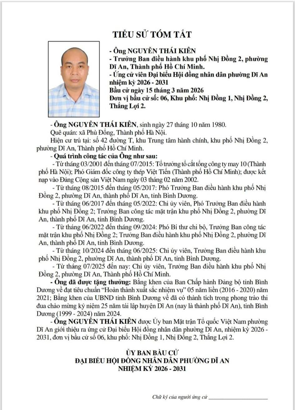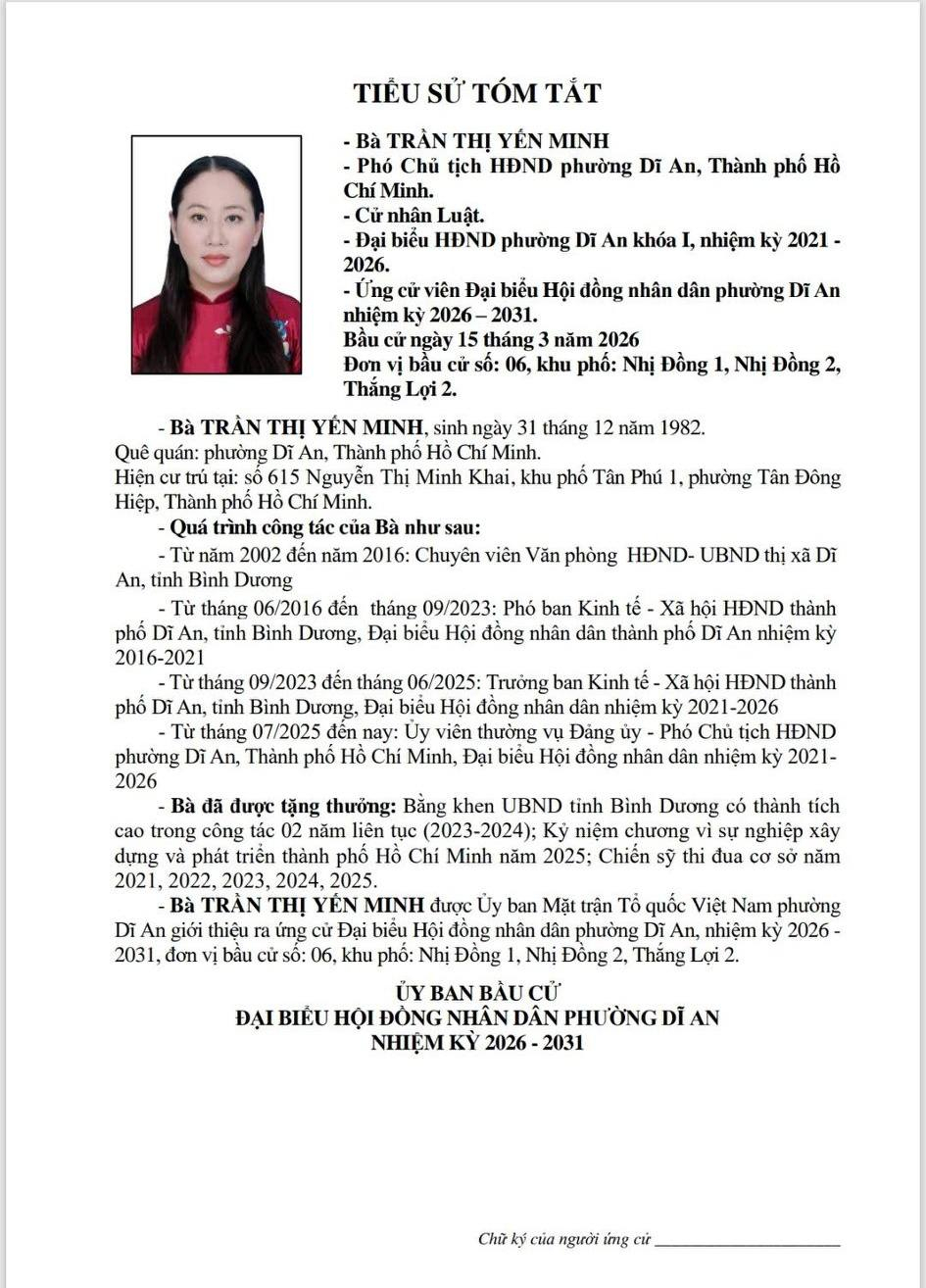 TIỂU SỬ TÓM TẮT CÁC ỨNG CỬ VIÊN ĐẠI BIỂU HỘI ĐỒNG NHÂN DÂN PHƯỜNG DĨ AN NHIỆM KỲ 2026 - 2031